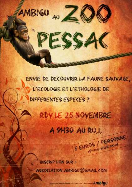 - Rendez-vous à 9h30 devant le RU1. Départ à 9h45 pour arriver 30minutes plus tard au zoo de Pessac (3 Rue du Transvaal 33600 Pessac).